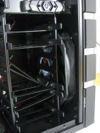 Der Innenraum des BitFenix Colossus ist komplett schwarz lackiert und besitzt den typischen Aufbau eines Gehäuses mit den Käfigen auf der rechten und Platz für Mainboard und Netzteil auf der linken Seite. Der Mainboardschlitten besitzt ein großes Loch, um CPU-Kühler einfacher montieren zu können. Außerdem viele gummierte Löcher, um die Kabel des Netzteils hinter dem Schlitten zu verstecken. Die Einbauschienen des Festplattenkäfigs waren durch den Transport aus ihren Halterungen gelöst. Dies spricht nicht für stabile Schienen, worauf später aber noch genauer eingegangen wird. Sehr stabil und mächtig wirken hingegen die Schnellverschlüsse für die Steckkarten.