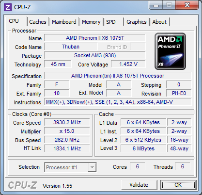 AMD Phenom II X6 1075T Overclocked – CPU-Z