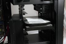 Die Festplatten können wie erwähnt in zwei unterschiedlichen Bereichen installiert werden. Eigentlich gibt es sogar noch eine dritte Möglichkeit, die unter dem Punkt „Betrieb“ genauer beschrieben wird. Die erste Möglichkeit ist der Festplattenkäfig hinter der Abdeckung. Dort wird die Festplatte auf gummierte Halterungen geschoben und an der Seite mit zwei Schrauben fixiert. Der obere Teil bietet auch Platz für zwei SSDs.