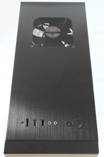 Die Rückseite ist nicht schwarz, sondern silber, besitzt aber ein schwarzes Lüftergitter. Aufgrund der geringeren Höhe sind nur vier Slotblenden vorhanden. Außerdem gibt es ein Loch für die Mainboardblende und ein weiteres für das Netzteil. Das gummierte Loch im oberen Bereich wird für das USB 3.0 Kabel benötigt.