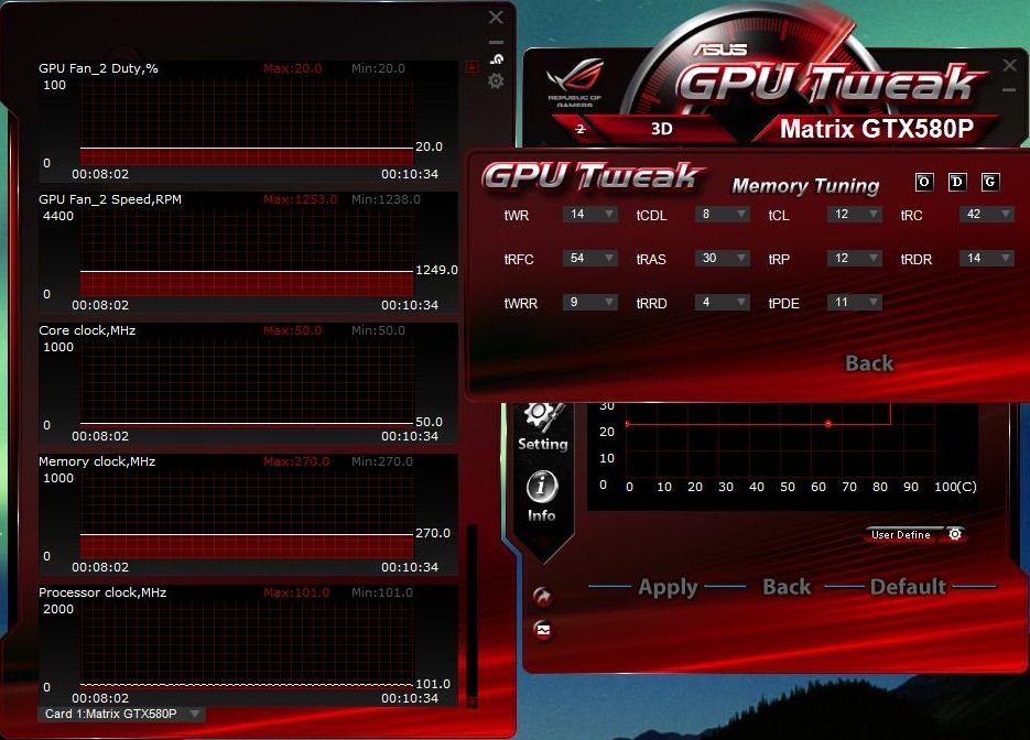 Die mitgelieferte Software GPU Tweak entpuppte sich als wirkliche Wunderwaffe für Overclocker. Einstellbar und anzeigbar war praktisch jede erdenkliche Einstellung, mit diesem Tool stehen einem daher alle Möglichkeiten offen. Da eine ausführliche Vorstellung des Programms den Rahmen des Test sprengen würde, lassen wir stattdessen einige Screenshots des Programms für sich sprechen.