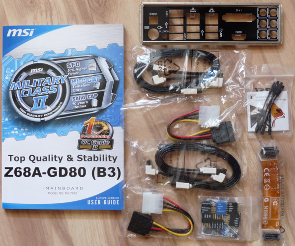 Das mitgelieferte Zubehör ist durchaus ansehnlich. Vier SATA 6 Gbit/s Kabel, die alle eine abgewinkelte Seite haben, zwei Molex-SATA-Stromadapter und die SLI-Brücke sind relativ normal in dieser Preisklasse. Die M-Connectors sind für die Gehäuseverkabelung sehr hilfreich.