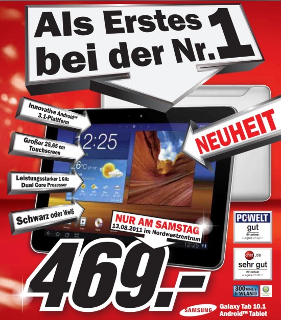 So darf Samsung zwar keine Galaxy Tab 10.1 Geräte mehr in die EU einführen – die Niederlande einmal ausgenommen -, aber Händler, die das Geräte bereits auf Lager haben, dürfen es auch verkaufen. Um dies zu verhindern, müsste Apple separat gegen Media Markt vorgehen. Das dürfte in der Kürze der Zeit allerdings schwer zu bewerkstelligen sein. Ein Media Markt in Frankfurt preist das Samsung Galaxy Tab 10.1 für 469 Euro an.