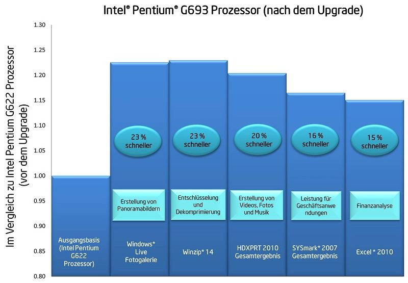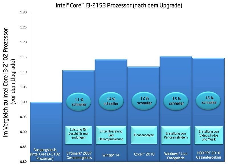 Bei den drei Modellen handelt es sich um die beiden Desktop-Prozessoren Core i3-2102 und Pentium G622 und um den Mobile-Prozessor Core i3-2312M. Während die beiden Desktop-Prozessoren nach dem Upgrade nur eine höhere Taktfrequenz besitzen, wird bei dem Core i3-2312M darüber hinaus auch mehr Cache freigeschaltet. Aber nicht nur die Spezifikationen verändern sich mit dem Upgrade, sondern auch die offzielle Bezeichnung der Prozessoren. So wird aus dem Core i3-2102 ein Core i3-2153, der Pentium G622 wird zu einem G693 und der Core i3-2312M trägt nach dem Upgrade die Bezeichnung Core i3-2393M.