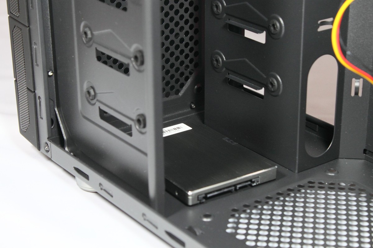 Eine SSD kann ebenfalls installiert werden, der Einbau ist aber nicht ganz so komfortabel. Verbaut werden kann sie nur liegend auf dem Boden des Gehäuses. Befestigt wird sie dann mit vier Schrauben direkt am Boden, wofür das Gehäuse auf die Seite gelegt werden muss. Je nach verwendeten Netzteilsteckern kann die Versorgung mit Strom zu Komplikationen führen.