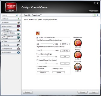 Wer selbst Hand an die Lüftersteuerung der Sapphire Flex HD 6970 BF3 legen will, darf die Drehzahl im Catalyst Control Center (CCC) auch selbst einstellen. Die kleinstmögliche Einstellung ist hier 20 %, was ungefähr 1400 Upm entspricht. Das ist etwas leiser als zuvor, denn der Lüfter ist dann nur noch leicht hörbar. Die Chiptemperatur erhöhte sich auch kaum – von 34°C auf lediglich 36°C im Desktop-Betrieb mit nur einem Monitor. Bei mehr als einem TFT haben wir mit 1400 Upm bis zu 50°C gemessen – auch nur wenig mehr als die 47°C bei der Standardeinstellung des Lüfters.