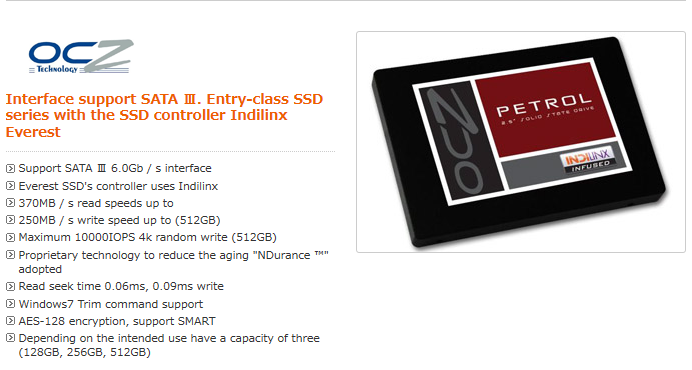 Nach OCZs „Octane“ SSDs kündigt sich mit „Petrol“ die zweite SSD-Serie von OCZ mit Indilinx-Everest-Controller an. Diese verfügen über eine SATA-III-Schnittstelle mit 6 Gbit/s, sind mit asynchronem MLC-NAND-Flash ausgestattet und werden mit Speicherkapazitäten von 128, 256 und 512 GByte erhältlich sein. Die sequentiellen Transferraten sollen je nach Modell bis zu 370 MByte/s beim Lesen bzw. bis zu 250 MByte/s beim Schreiben betragen.