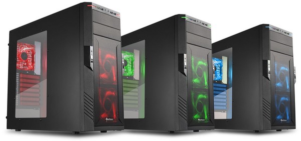 Äußerlich wartet das Sharkoon T28 mit einem schwarzen Korpus und einem gradlinigen Mesh-Frontdesign auf. Power- und Reset-Button sind elegant verchromt. An Frontanschlüssen stehen neben Audio-In/Out drei USB2.0-Ports und eine USB3.0-Schnittstelle bereit. Ein Acryl-Fenster im linken Seitenteil gibt Einblick in den Innenraum mit farbig lackiertem Mainboardtray. Zur Auswahl stehen drei Farbeditionen: Rot, Grün und, angeregt durch zahlreiche Kundennachfragen, erstmals Blau. Ebenfalls in der Editionsfarbe leuchten die Betriebs- und die Festplatten-LED sowie die drei vorinstallierten 120-mm-Lüfter. Zwei Ventilatoren rotieren in der Front, der dritte in der Rückseite. Alle besitzen einen 4-poligen Netzteil- und einen 3-poligen Mainboard-Anschluss.