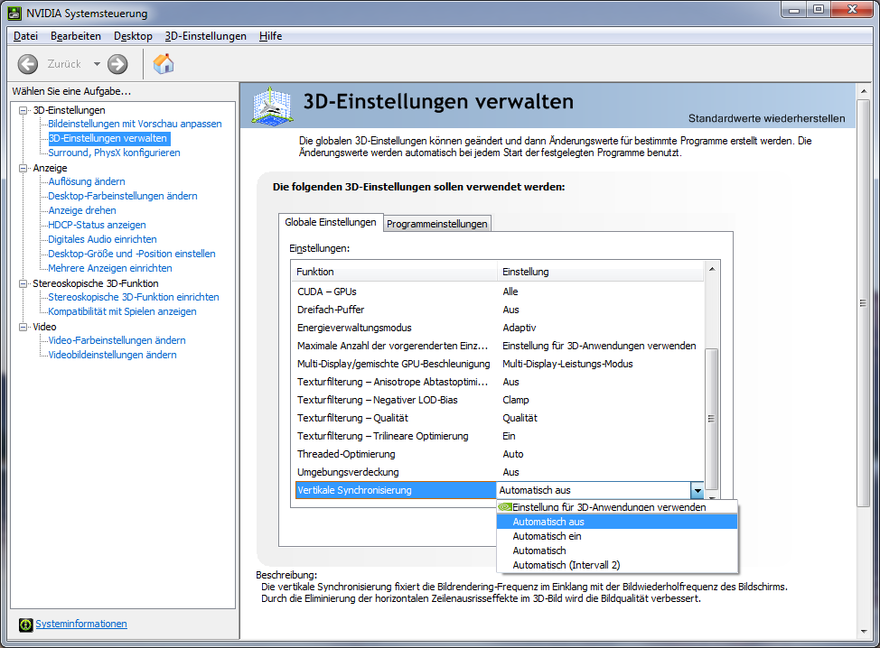 Für die dreidimensionale Darstellung mit 3D-Brille (3DVision) ist Adaptive VSync