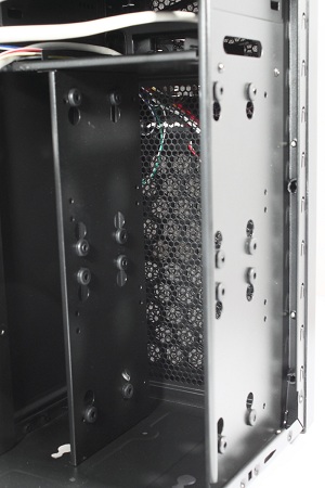 Das Innere des Rasurbo SC-08 Gehäuses wurde ebenfalls komplett schwarz lackiert und auch die Thumb-Screws und die Gummierungen am Festplattenkäfig wurden schwarz gehalten. Die Aufteilung des Innenraums ist mit einem durchgängigen Käfig auf der rechten Seite und dem Platz für das Mainboard auf der linken Seite klassisch gestaltet worde. Das Netzteil wird beim SC-08 im oberen Teil montiert.