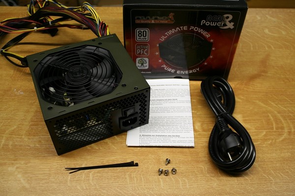 Das Netzteil ist fest verkabelt und nur der ATX 20+4 Strang ist mit stark durchscheinendem Geflecht gesleevet. Neben zwei Laufwerksträngen gibt es nur noch einen 6+2 PCI Express Stecker für die Grafikkarte und einen 4+4 CPU-Stecker für das Mainboard.