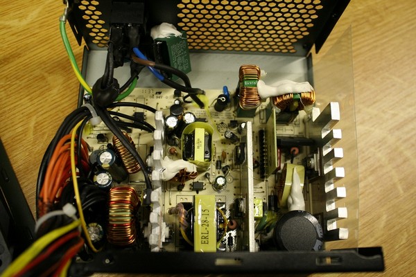 Das recht leere Netzteil wirkt teilweise etwas lieblos zusammengesetzt, z.B. die Filterbauteile oder Klebestellen. Auf der einfachen Platine findet sich jedoch der ein oder andere höherwertige Hochtemperaturkondensator zwischen den groben Kühlkörpern.
