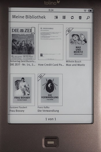 Der Toline Shine ist wenige Sekunden nach dem Zurückschieben des Powerknopfes einsatzbereit. Bis auf die Auswahl des Landes muss nichts eingerichtet werden. Das Gerät kann dann direkt genutzt werden, ein Benutzerkonto oder ähnliches wird grundsätzlich nicht benötigt. Auf dem eBook Reader sind drei Bücher vorinstalliert, so dass man direkt einen ersten Test vornehmen kann.