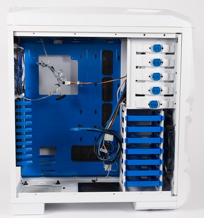 Der Innenraum des AeroCool GT-S White Edition ist grundsätzlich weiß, besitzt aber auch sehr viele blaue Elemente. Der gesamte Mainboardschlitten ist blau, genau wie die Halterungen für die Steckkarten, die Einbauschienen für die Festplatten und die Schnellverschlüsse für die Laufwerke. Der Aufbau ist ansonsten eher klassisch gewählt worden. Er ist zudem nicht veränderbar, alle Teile sind fest mit dem Gehäuse vernietet.