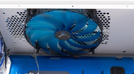 Neben dem Netzteil befindet sich ein Staubfilter, auf dem sich kein Lüfter installieren lässt. Im Top können dagegen zwei 120-mm-Lüfter verbaut werden, wenn der schon vorhandene 200-mm-Lüfter entfernt wird. Platz ist dort ebenfalls für einen einzelnen 230-mm-Lüfter. Staubfilter gibt es für die oberen Lüfter nicht.