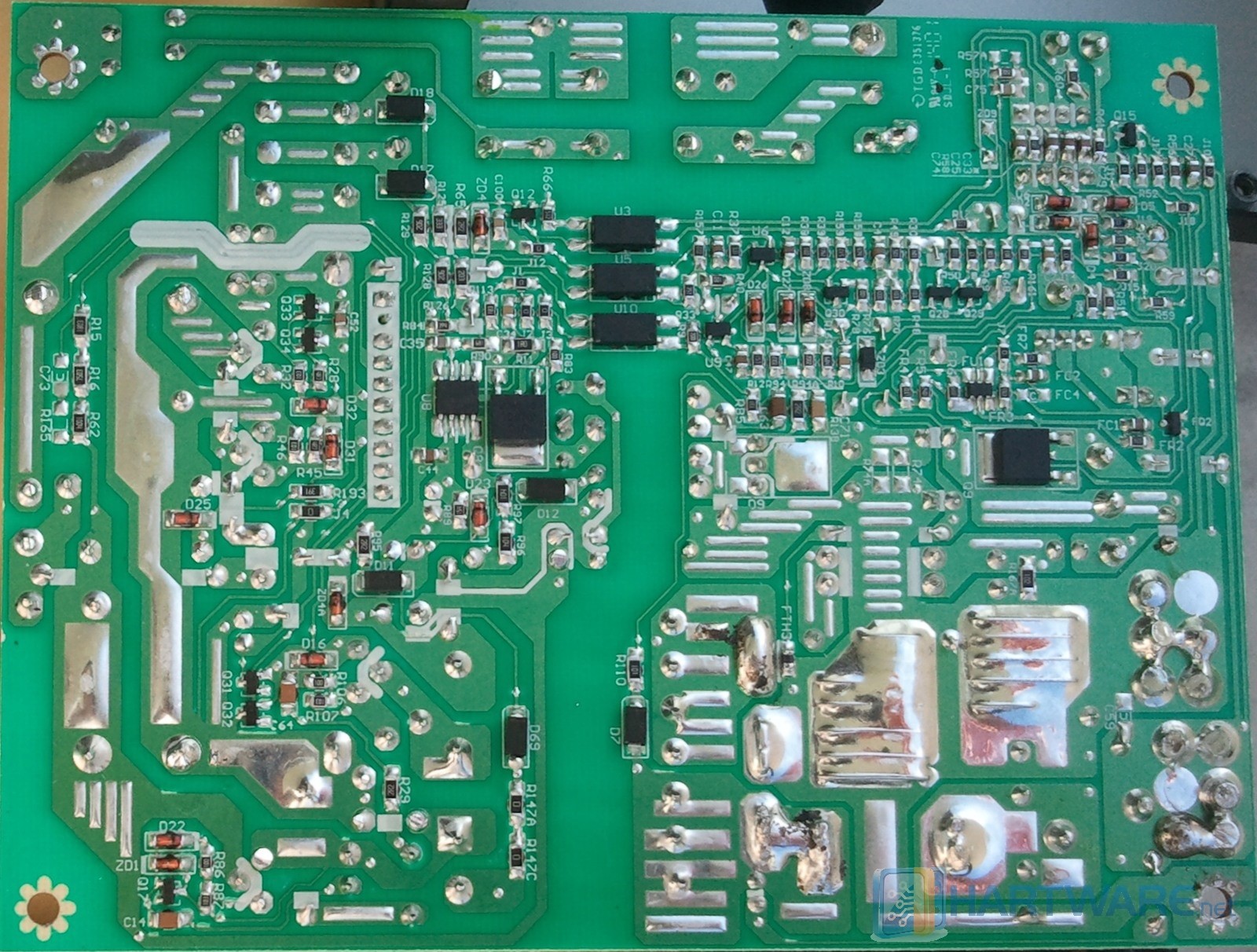 Mittig ist ein zweiter Lüfteranschluss (Bezeichnung FTH) positioniert. Dieser ist als Anschluss für einen Thermistor vorgesehen, der eigentlich auf dem kleinen Blech montiert und dort die Temperatur überwachen sollte. Dieser fehlt hier aber. Entweder wird der Lüfter über Last gesteuert oder auf einem der ICs könnten noch Temperatursensoren integriert sein.