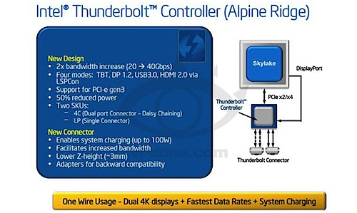 Intel soll mit „Alpine Ridge“ die nächste Generation der Thunderbolt-Schnittstelle vorbereiten, welche die Übertragungsgeschwindigkeiten auf bis zu 40 Gigabit pro Sekunde erhöhen könnte. Dennoch soll der Strombedarf um bis zu 50 % sinken. Werden externe Geräte über die Schnittstelle aufgeladen, soll Alpine Ridge aber bis zu 100 Watt liefern. Alpine Ridge soll mit DisplayPort 1.2, PCI-Express 3.0, HDMI 2.0 und USB 3.0 kompatibel sein. Auch Daisy-Chain-Vernetzungen mehrerer Geräte sollen weiterhin möglich sein.