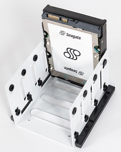 Bis zu acht 3,5″-Festplatten können in den beiden Halterungen senkrecht im Gehäuse befestigt werden. Sie werden dort auch leicht entkoppelt, müssen aber geschraubt werden, Schnellverschlüsse sind also nicht vorhanden. SSDs lassen sich in diesen Halterungen nicht verbauen.