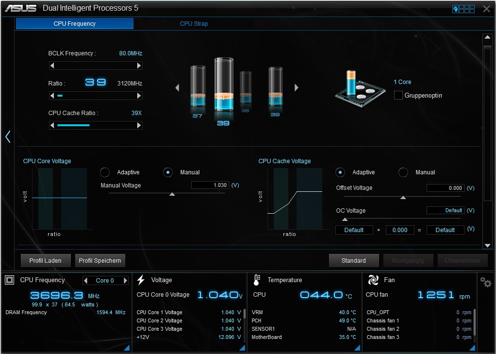 (*) Im Normalzustand besitzen die vier realen Kerne der CPU unterschiedliche Turbomodi, diese haben wir für das Overclocking auf ein Niveau gebracht.