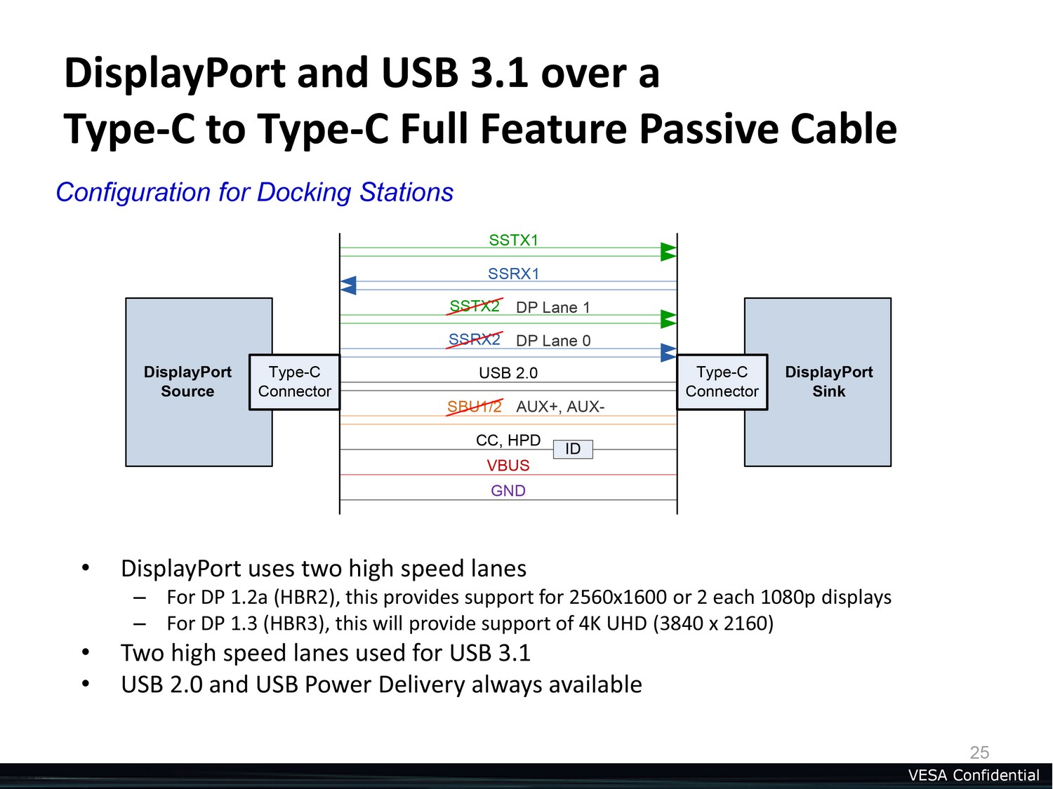 Zusammen mit dem „USB Implementers Forum“ hat die VESA Organisation den „DisplayPort Alternate Mode“ ausgearbeitet, der erlaubt, dass native DisplayPort-Signale über USB Type-C Stecker und Kabel übertragen werden können. Dabei werden einige der USB-Lanes für DisplayPort verwendet, wobei vorausgesetzt wird, dass die Geräte auf beiden Seiten dafür geeignet sein müssen. Interessanterweise benötigt man aber nicht die gesamte Bandbreite für den „DP Alt Mode“, d.h. es können auch gleichzeitig noch USB (2.0) Signale und USB-Power transferiert werden. Sollte man nicht alle (vier) verfügbaren Lanes für DisplayPort verwenden, ist sogar USB 3.0 (oder USB 3.1) möglich.
