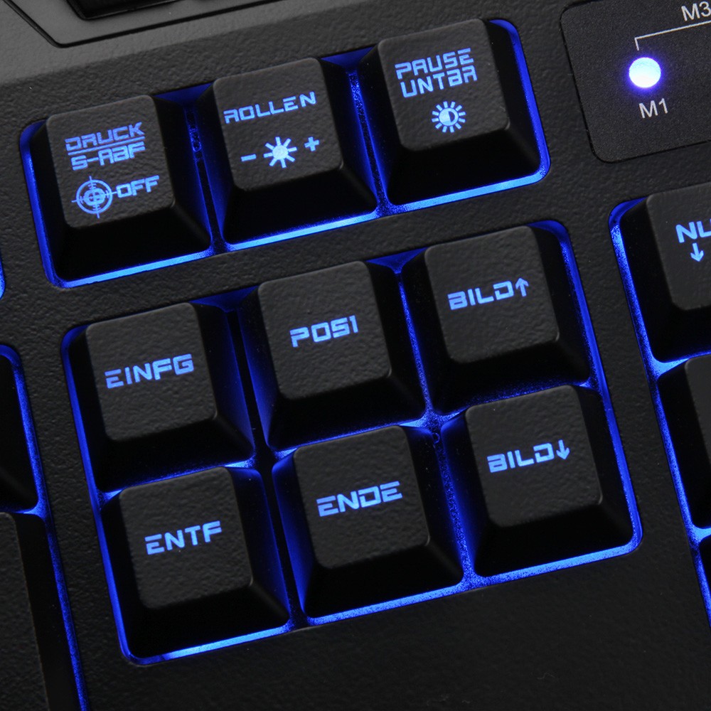 Über die bequem erreichbaren Makro-Taste können geplante Aktionen im Spiel noch schneller ausgeführt werden. Die Programmierung gestaltet sich kinderleicht und dank des On-Board Speichers können die spezifischen Einstellungen einfach an jedem beliebigem PC-System genutzt werden. Zudem lassen sich drei individuelle Profile in der Tastatur speichern und können jeweils per Sondertaste aktiviert werden. Ebenfalls anpassbar ist die Hintergrundbeleuchtung: in 10-Prozent-Schritten bis zur maximalen Leuchtkraft, pulsierend oder komplett deaktiviert. Insgesamt neun Multimedia-Tasten ermöglichen eine noch komfortablere Nutzung verschiedenster Windows-Funktionen, wie beispielsweise der Lautstärkeregelung oder Play/Pause.