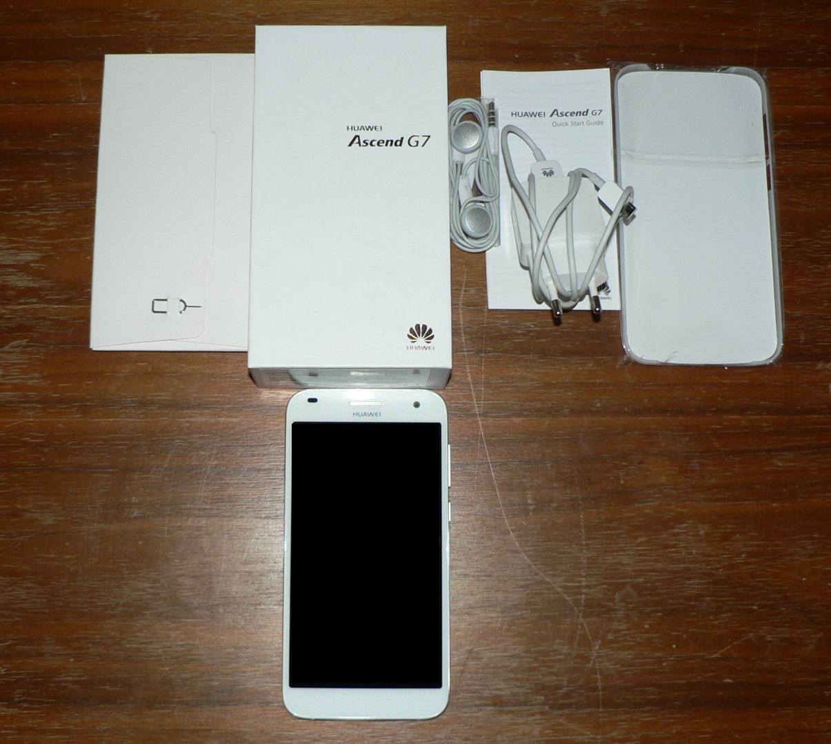 Huawei liefert beim Ascend G7 neben dem Smartphone selbst noch ein weißes USB-Ladegerät mit entsprechendem Kabel, eine Kurzanleitung, eine Schutzhülle für die Rückseite und einen kleinen Key zum Herausziehen der Abdeckungen für den microSD-/SIM-Kartenslot mit. Auf Kopfhörer mussten wir bei unserem Testmuster leider verzichten – potentielle Käufer sollten aber eines mitgeliefert bekommen.