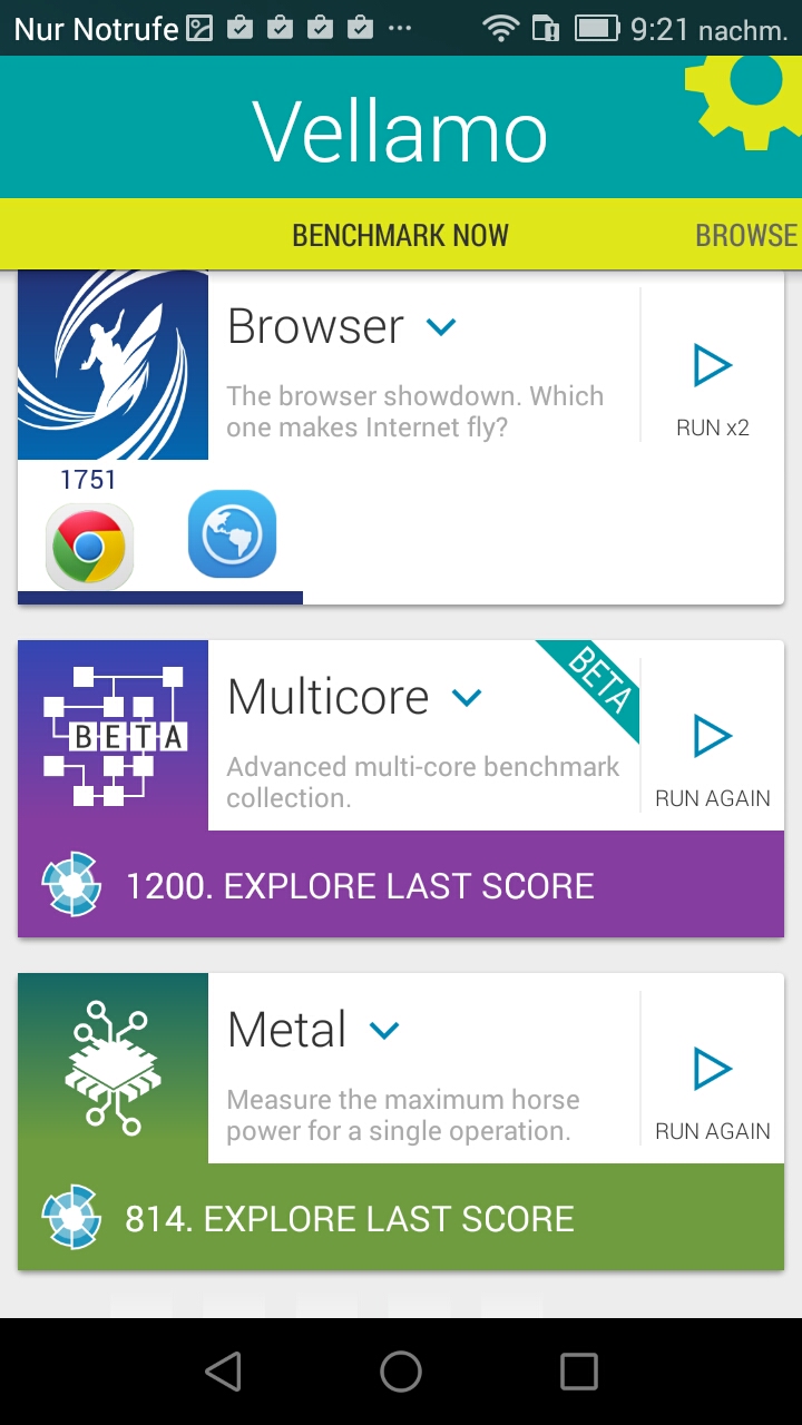 Dann haben wir da noch Qualcomm Vellamo: Für Google Chrome hagelt es im Browser-Test 1751 Punkte. Huaweis eigener Browser schnitt bei uns im Test mit 1319 Punkten übrigens schlechter ab. Im Multicore-Benchmark sind solide 1200 Punkte das Ergebnis. Metal dagegen eröffnet uns für das G7 rund 814 Punkte.