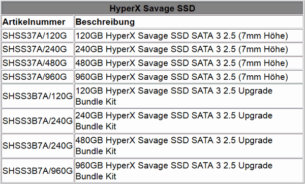 Die HyperX Savage gibt es in vier unterschiedlichen Kapazitäten: 120 GB, 240 GB, 480 GB und 960 GB. Erhältlich ist sie sowohl als Stand-Alone-Laufwerk als auch mit Upgrade-Bundle. Dieses Kit beinhaltet ein 2,5″-USB 3.0-Gehäuse, eine 3,5″-Halterung und Befestigungsschrauben, ein SATA-Datenkabel, Software5 zum Klonen der Festplatte, ein Multi-Bit-Schraubendreher und ein 7 mm auf 9,5 mm-Adapter.