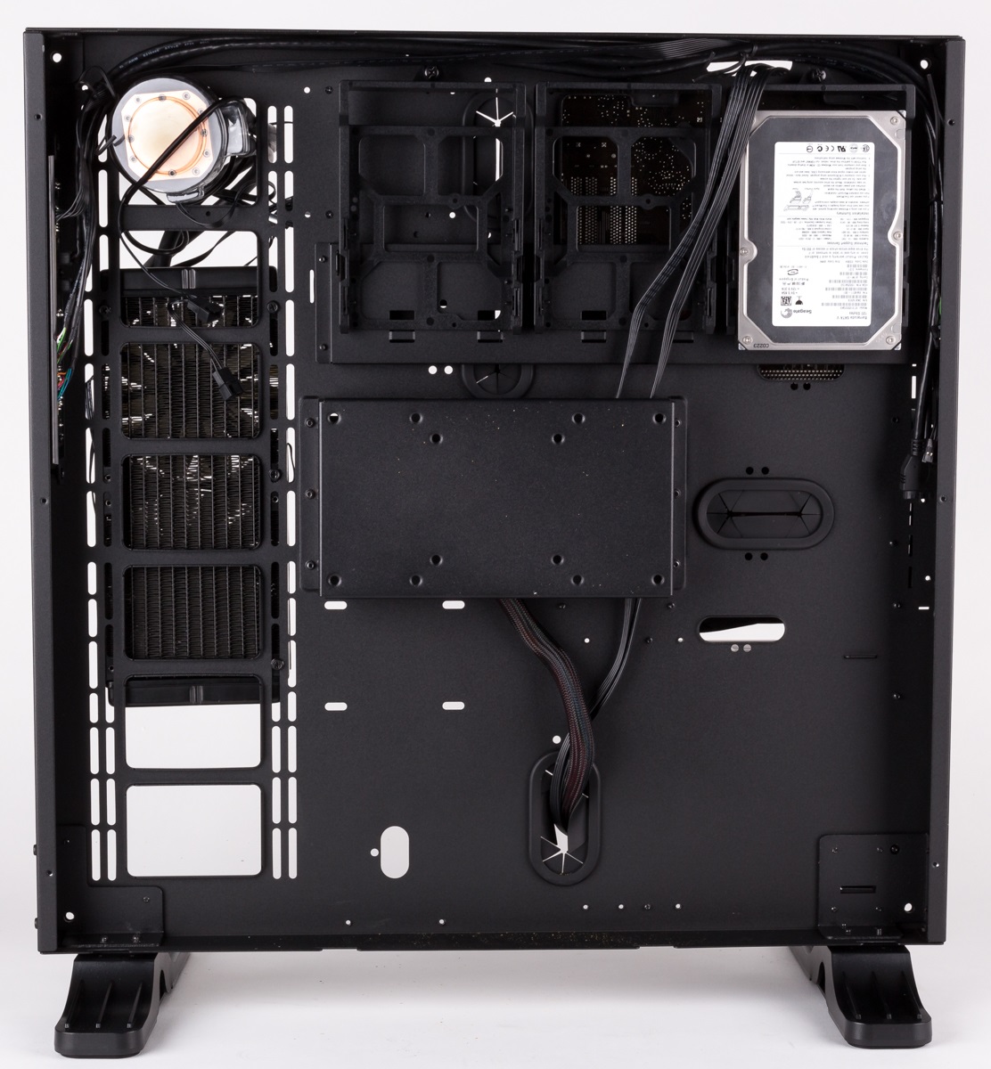 Grundsätzlich lassen sich die Kabel gut verlegen, da auf der Rückseite ausreichend Platz zur Verfügung steht, um überflüssige Kabel verstecken zu können. Eine Einschräkung gibt es nur, wenn auf der Rückseite alle drei Festplattenplätze belegt werden, was wir auf der nächsten Seite genauer darstellen. Durch die gedrehte Grafikkarte kann die gesamte Hardware präsentiert werden, allerdings ist der Einbau einer Wasserkühlung fast Pflicht, da ansonsten knapp 50 Prozent der verfügbaren Fläche ungenutzt bleiben, was optisch nicht mehr ansprechend aussehen dürfte.