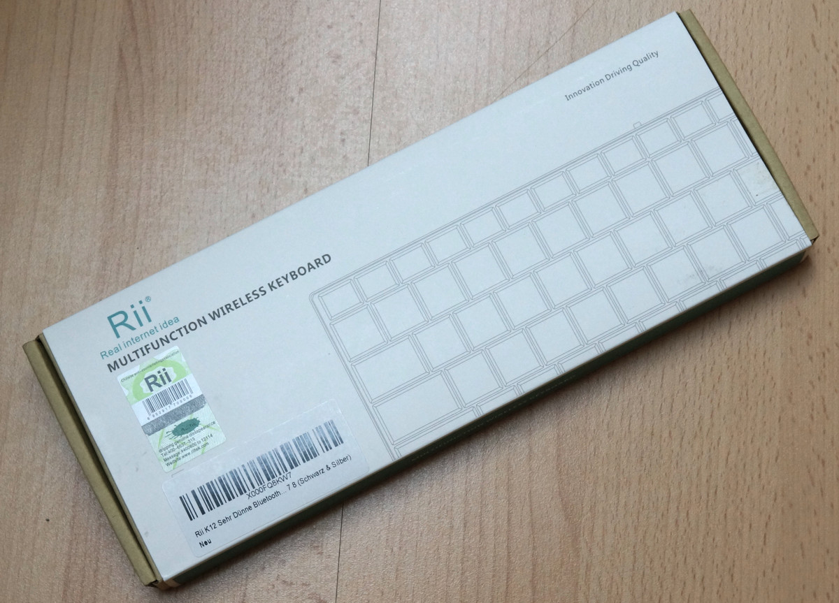 Damit kommen wir auch zu unserem Testobjekt, der Rii Mini K12 von Riitek, welche mit Bluetooth 3.0 oder einem 2,4-GHz-Stick verfügbar ist. Mit einer Größe von 260x83x13,5 mm ist sie etwa so breit wie ein 10-Zoll-Tablet, die 205 Gramm Gewicht sind genau richtig. Es wirkt sehr stabil, klappert nicht und kann problemlos längere Zeit in den Händen gehalten werden. Dies ist vor allem auf dem Sofa praktisch. Zum Schreiben längerer Texte benötigt die K12 aber eine Unterlage – gleichzeitig Schreiben und Halten der Tastatur ist mit normal großen Händen nicht möglich.