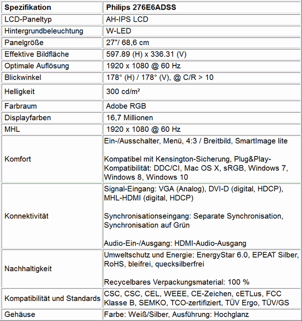 Ansonsten entspricht der Philips 276E6ADSS eher dem Standard eines aktuellen 27-Zoll-Monitors. Das IPS-ADS-Panel liefert 1920×1080 Pixel bei 60 Hz, ein Kontrastverhältnis von 1000:1, eine Helligkeit von 300 cd/m², Blickwinkel von 178 Grad und eine Reaktionszeit von 5 Millisekunden. Als Anschlüsse gibt es einmal DVI und einmal HDMI. Als Besonderheit unterstützt der HDMI-Port MHL (Mobile High Definition Link), d.h. geeignete Smartphones und Tablets können direkt angeschlossen und deren Inhalte auf dem Monitor wiedergegeben werden.