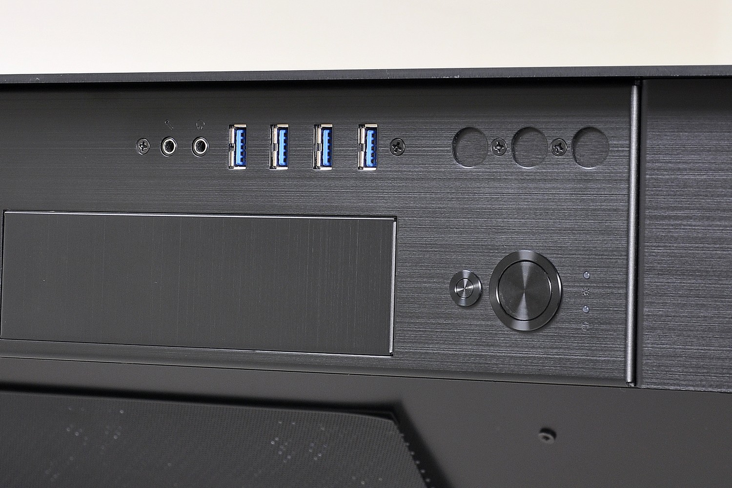 Vier übereinanderliegende, durch Gummibeschichtung vibrationsgedämpfte Laufwerksschienen können insgesamt acht 2,5- oder 3,5-Zoll Laufwerke aufnehmen. So können die Laufwerke leise und zuverlässig betrieben werden. Die Schienen sind mit Rändelschrauben befestigt und lassen sich dementsprechend leicht montieren. Zusätzlich bietet der DK-04 einen externen 5,25-Zoll-Einschub, der ein optisches Laufwerk, eine Lüftersteuerung oder sonstige Extras beherbergen kann. Darüber hinaus bietet das Frontpanel vier USB-3.0-Ports, HD-Audio-Buchsen und eine Aufnahmemöglichkeit für den RGB-Controller des optional erhältlichen Lighting-Kits.