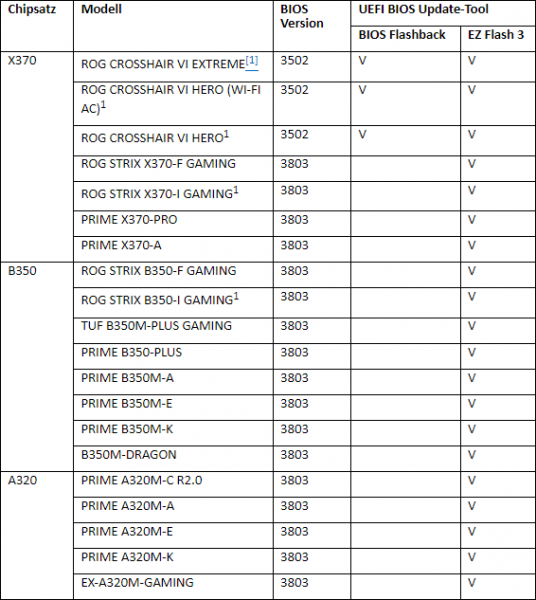 Die Liste der ASUS-Mainboards, die AMD Ryzen Desktop-Prozessoren mit Radeon Vega-Grafik unterstützen, ist wie folgt: