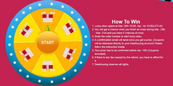 Wer bis zum 2. April eine Bestellung bei Geekbuying aufgibt, kann darüber hinaus am sogenannten „Lucky Draw“ teilnehmen. Hier kann man $50-Rabattcodes gewinnen, wenn man Glück hat.