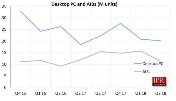 Normalerweise ist das zweite Quartal schwächer als das erste und so gingen die Verkaufszahlen dann sequenziell auch um satte 28 % zurück. Darüber hinaus fielen die Verkäufe einzelner Grafikkarten, also nicht als Teil eines Komplett-PCs, im Quartalsvergleich stärker als der Markt von Desktop-PCs.
