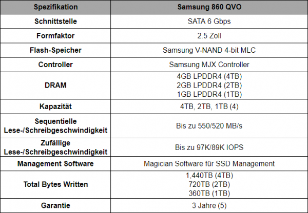 Die Langlebigkeit der 860 QVO spiegelt sich auch in ihrem Total-Bytes-Written-Wert (TBW) wider: Samsung bietet eine dreijährige Garantie (3) oder 1.440 Total Bytes Written (TBW) für die 4-TB-Version und entsprechend 720 TBW und 360 TBW für die 2-TB- bzw. 1-TB-Version.