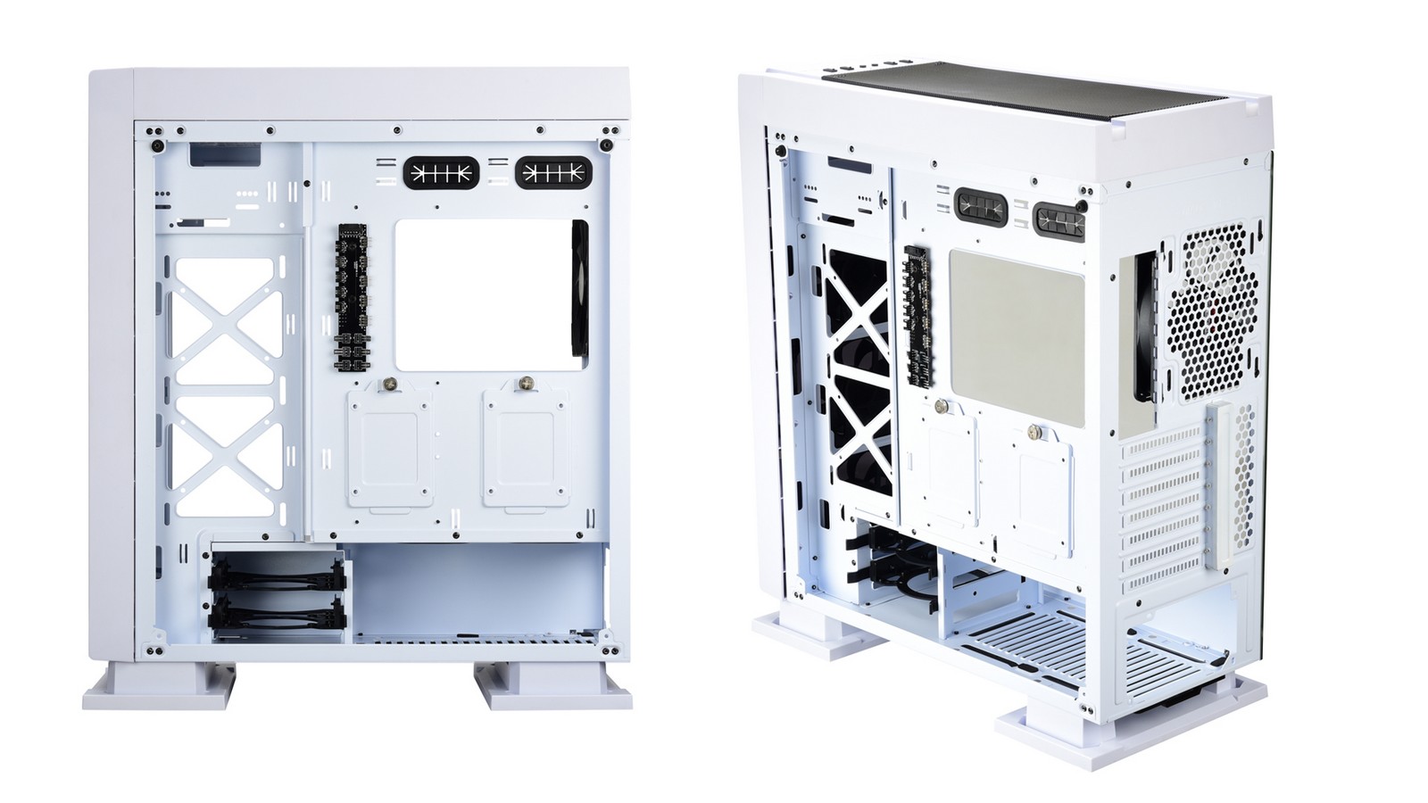 Ein Netzteiltunnel sorgt für eine aufgeräumte Struktur, die Kabel, Netzteile und Speichermedien unterbringt. Sogar ein externes 5,25″ Gerät, wie z.B. klassische DVD-Laufwerke oder Frontblenden-Controller, können an der Vorderseite eingebaut werden. Mehrere Montageplätze für Lüfter und Wasserkühler bieten hervorragende Möglichkeiten für DIY-Systeme mit Custom Loops.