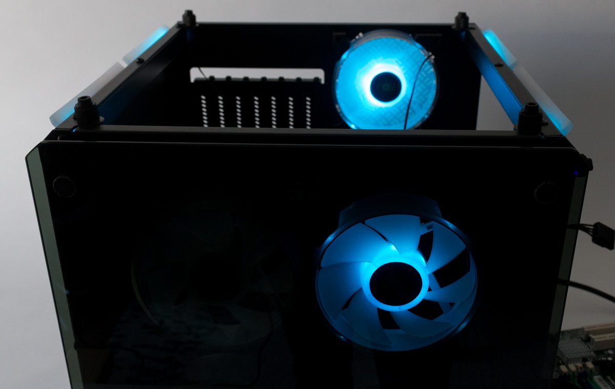 Die seitlichen Streifen am Gehäuse leuchten im Betrieb in der gleichen Farbe wie die Lüfter, was in den unteren Bildern teilweise abgebildet ist.