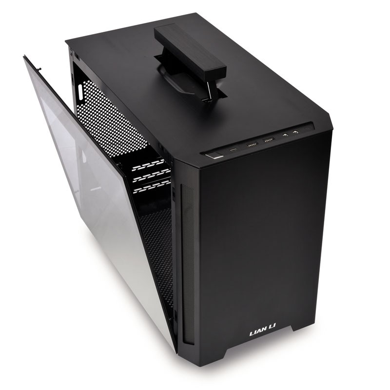 Das TU150 von Lian Li bringt viele Features in einem kompakten Mini-ITX-Gehäuse unter und ist mit seinen kompakten Maßen sowie dem praktischen ausklappbaren Griff an der Oberseite besonders einfach zu transportieren. Kräftige Gaming-Hardware ist trotz Mini-Bauweise kein Problem, denn CPU-Kühler bis 16,5 Zentimeter Höhe und Grafikkarten bis 32 Zentimeter Länge sind möglich. Platzsparende SFX- oder SFX-L-Netzteile sorgen für eine adäquate Stromversorgung. Das I/O-Panel an der Oberseite verfügt neben den obligatorischen Audio-Anschlüssen und Power/Reset-Buttons über einen USB-3.1-Typ-C- und zwei USB-3.0-Ports vom Typ A.