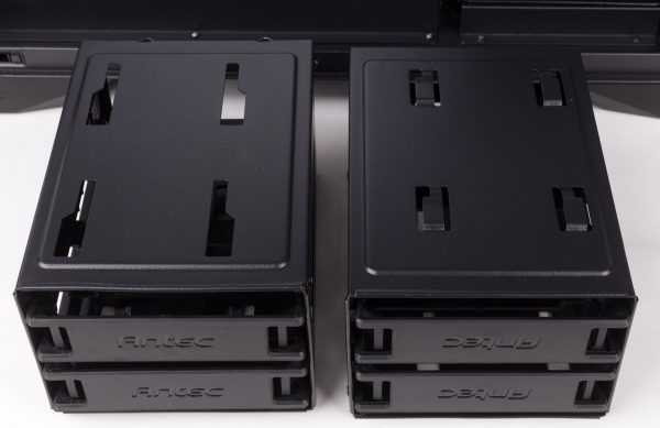 Jeweils zwei Festplattenplätze hängen zusammen, können aber einzeln entfernt werden. In der Praxis stimmt dies allerdings nur halb. Tatsächlich ist es möglich, zum Beispiel nur die beiden oberen und die beiden unteren Halterungen für Festplatten zu verwenden. Dafür müssen in einem ersten Schritt aber alle Zweierkombinationen entfernt werden, da diese ineinander einrasten und daher nicht aus der Mitte entfernt werden können. Der Umbau ist also etwas umständlich, die vorhandene Möglichkeit dagegen gut.