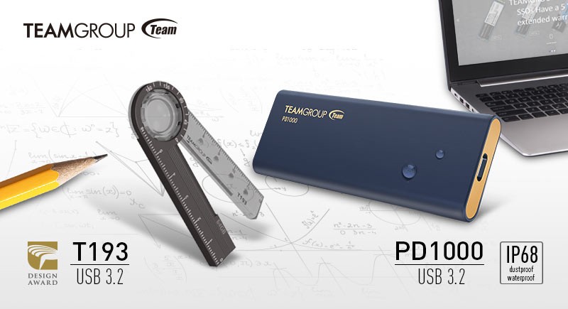 Today, TEAMGROUP releases two storage products, the T193 Stationery Flash Drive and the PD1000 Portable Solid State Drive. The T193 Stationery Flash Drive combines multifunctional stationery design and applications. Functions such as a 180-degree protractor, magnifying glass and magnet are all on this flash drive and offering 128GB of large capacity available to choose from. PD1000 Portable Solid State Drive uses USB 3.2 Gen2 ultra high-speed interface. The read/write speed is up to 1000/900 MB/s. It complies with the IP68 certification, which is dustproof, waterproof and 1600kg pressure proof. These two unique and creative devices will change the data storage industry of 2020.