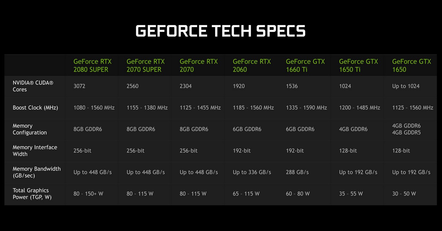So verfügt auch die GeForce RTX 2080 Super für Notebooks über 3072 CUDA-Kerne und die mobile GeForce RTX 2070 Super ebenfalls über 2560 Shader-Einheiten. Neben niedrigeren Taktfrequenzen wird auch Low-Power GDDR6-Grafikspeicher unterstützt. Dazu wurden die nominellen TDP-Angaben auf 150 Watt für die RTX 2080 Super und auf 115 Watt für die RTX 2070 Super gesenkt. Darüber hinaus bietet Nvidia den Laptop-Herstellern auch Max-Q-Versionen beider GPUs an mit noch etwas niedrigeren Taktraten sowie TDP von 80 Watt.