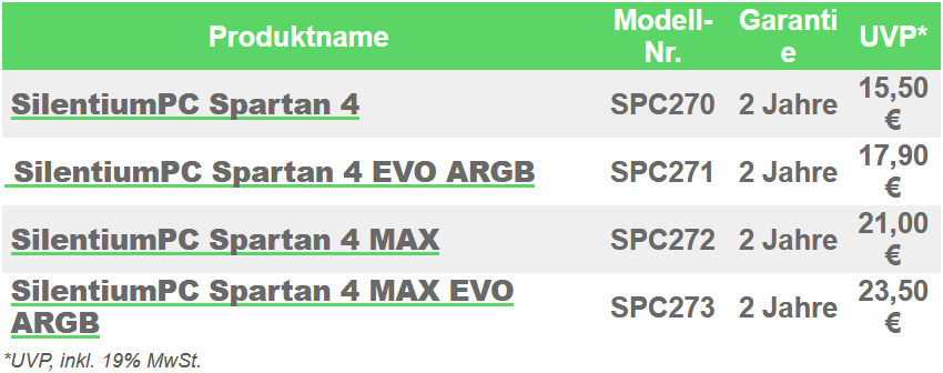 Dadurch eigenen sich die neuen Spartan 4 Modelle ausgezeichnet für ambitionierte PC-Bauvorhaben bei limitiertem Budget und als Upgrade für bestehende PCs mit Boxed-Kühler, die durch mehr Leistung bei geringerem Schalldruckpegel aufgewertet werden sollen.