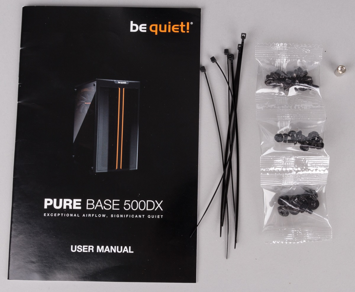 Der Lieferumfang des Pure Base 500DX besteht aus einer ausführlichen Anleitung, einigen Einwegkabelbindern, einem Tool zur Befestigung der Mainboardabstandhalter und diversen Schrauben für den Einbau der Hardware. Die Schrauben sind einzeln verpackt, allerdings in nicht wieder verschließbaren Tüten, so dass nach der ersten Verwendung alle Schrauben zusammen in der Haupttüte verpackt werden müssen.