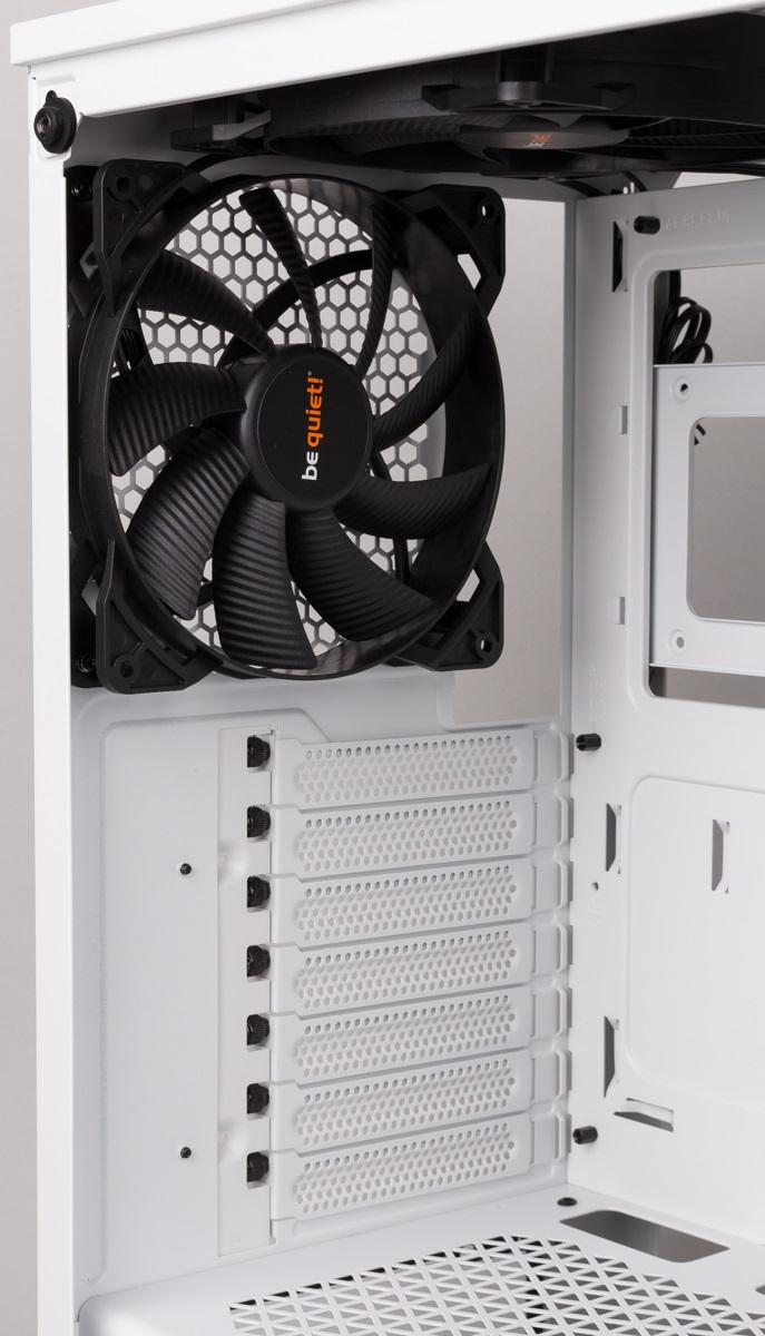 Im hinteren Teil des Gehäuses wurde ein 140-mm-Lüfter vorinstalliert. Hinter der Front befindet sich ein weiteres 140er Exemplar. Dieses kann durch einen weiteren 140er Lüfter ergänzt oder durch drei 120-mm-Lüfter ersetzt werden. In diesen Bereichen gibt es keine Unterschiede zum Vorgänger.