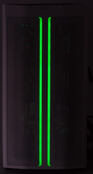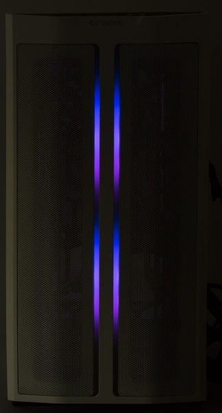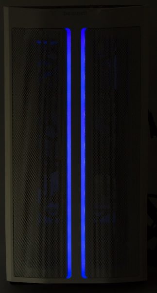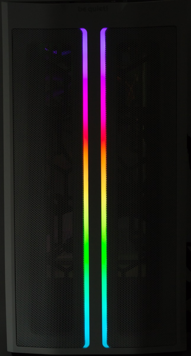 Über den angesprochenen Knopf kann die Farbe der Beleuchtung und auch die Beleuchtungsart zum Beispiel pulsierend oder laufend eingestellt werden. Dafür sind entsprechend viele Tastendrucke notwendig und da es keinen „Zurück-Knopf“ gibt, dürften einige Fingerdrücke notwendig sein, um die endgültig gewünschte Einstellung zu erreichen. Alternativ ist auch eine Steuerung über das Mainboard möglich.