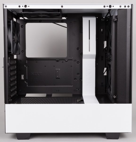 Im schwarzen Innenraum fällt der weiße Streifen sofort auf, hinter dem Kabel versteckt oder ein Ausgleichbehälter befestigt werden kann. Dadurch sollte ein aufgeräumter Lock erzeugt werden können, da Festplatten, SSDs und das Netzteil unter der unteren Blende verschwinden.