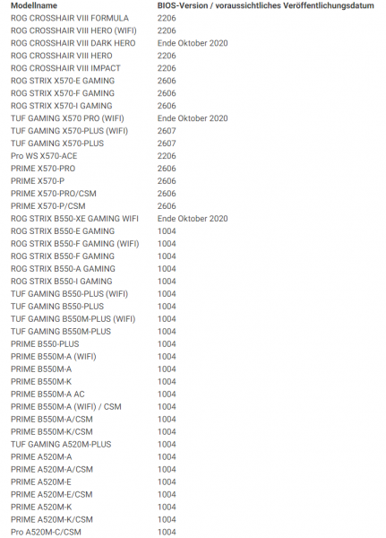 Alle Mainboards der ASUS 500er-Serie (X570, B550 und A520) sind optimiert und bereit für AMD Ryzen Zen 3 Prozessoren. ASUS ist bestrebt, die beste BIOS-Unterstützung zu bieten, und wird das BIOS weiter optimieren, um die beste Leistung und Benutzerfreundlichkeit zu bieten. Eine vollständige Liste finden Sie in der nachstehenden Tabelle.