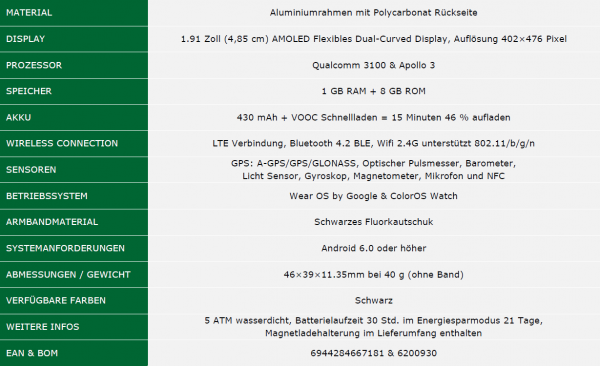 Die OPPO Watch 46 mm LTE ist in Deutschland ab sofort exklusiv im offiziellen Vodafone Shop auf Amazon zu einem Preis von 399 Euro (UVP) vorbestellbar und ab dem 08. November erhältlich. Für die Vernetzung der OPPO Watch 46mm LTE bietet Vodafone den Tarif OneNumber als eSIM an.