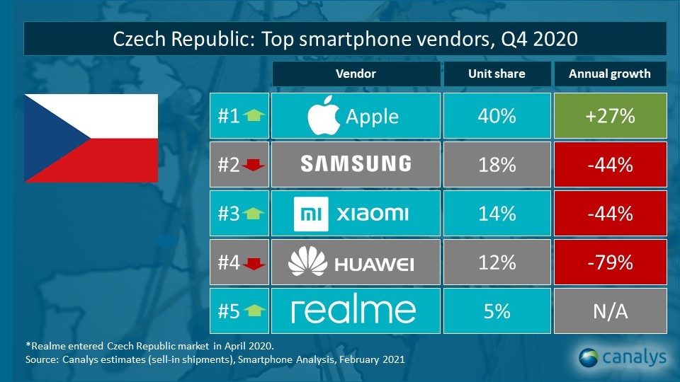 So gehört realme in Europa, namentlich in Griechenland und Tschechien, zu den Top 5 Smartphone-Anbietern, laut der Q4 2020-Auswertung des Analyseunternehmens, trotz des weltweit leicht schrumpfenden Smartphone-Marktes.
